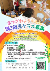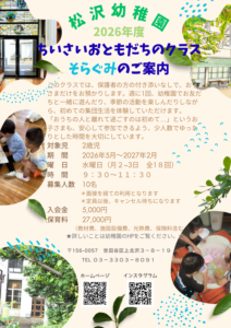 松沢幼稚園では、未就園児向けの「お庭で遊ぶ会」(雨天時は「お部屋で遊ぶ会」)を開催いたします。広々とした園庭で、砂場・コンビカー・三輪車などを使って、のびのびと遊びましょう。動きやすく、汚れてもよい服装でお越しください。必要な方は着替えもご持参ください。
